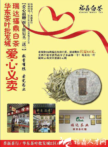 大愛無疆、真情永在。8月3日16點30分云南魯甸發生6.5級大地震,災情嚴重,作為一家有強烈社會責任感的企業,福鼎市瑞達茶葉有限公司“秉持公益、情系災區”,聯合陜西省西安華東茶城、香新茶行,在華東茶城舉行二場“華東茶城·瑞達福鼎白茶義賣獻愛心”活動。